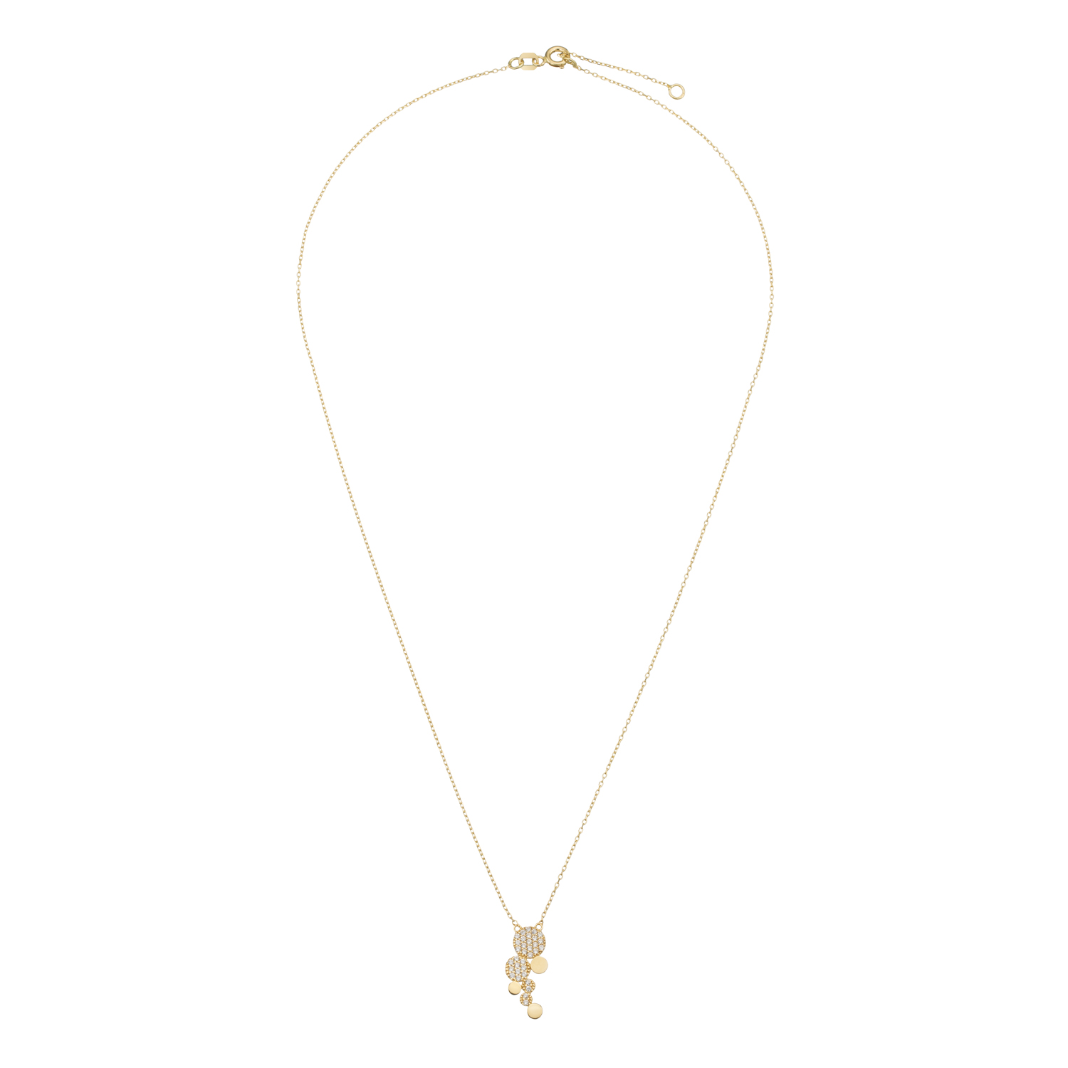 Gouden collier met hanger van cirkels met en zonder zirconia's, lengte 45cm.