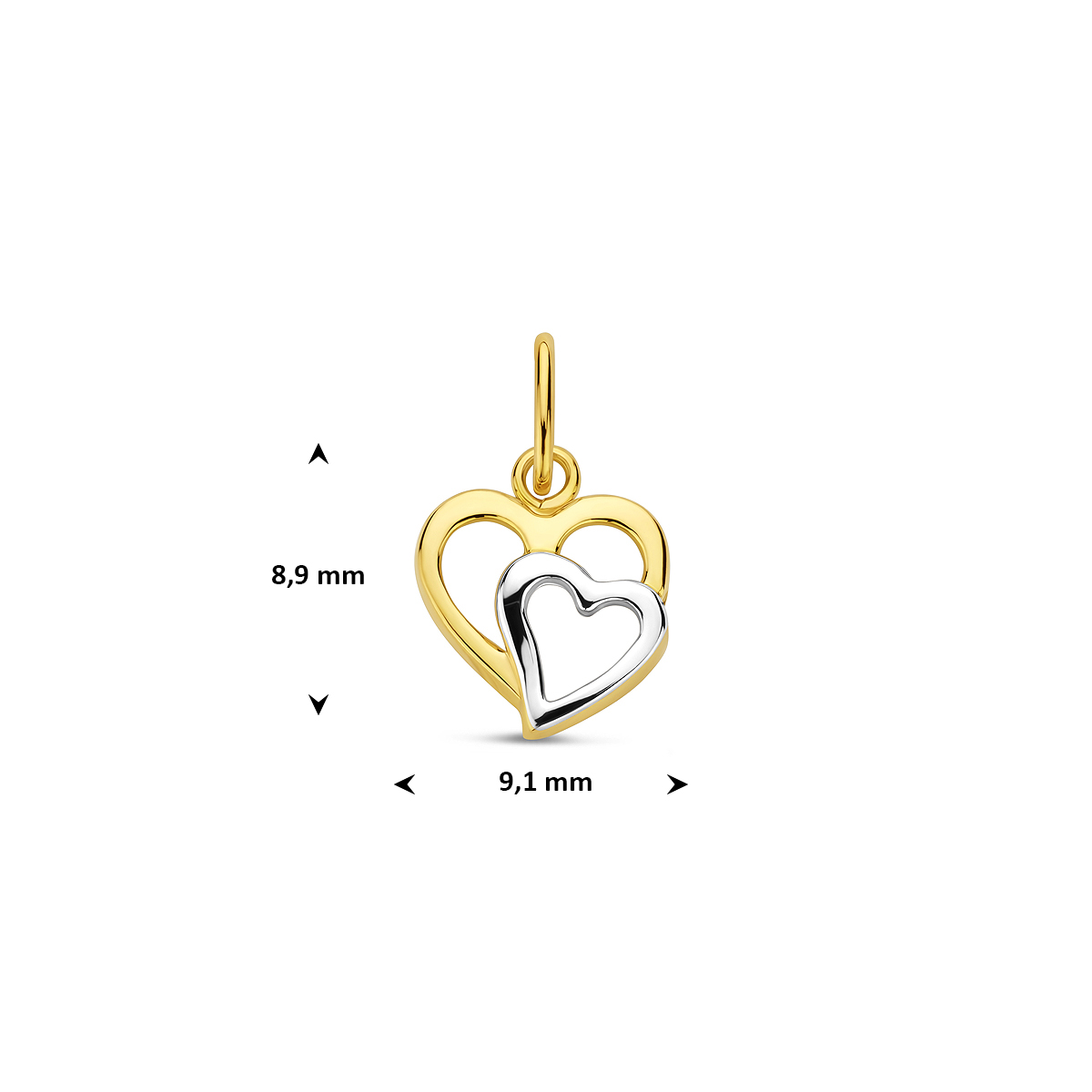 Bicolor wit- en geelgouden hanger met een dubbel hart.