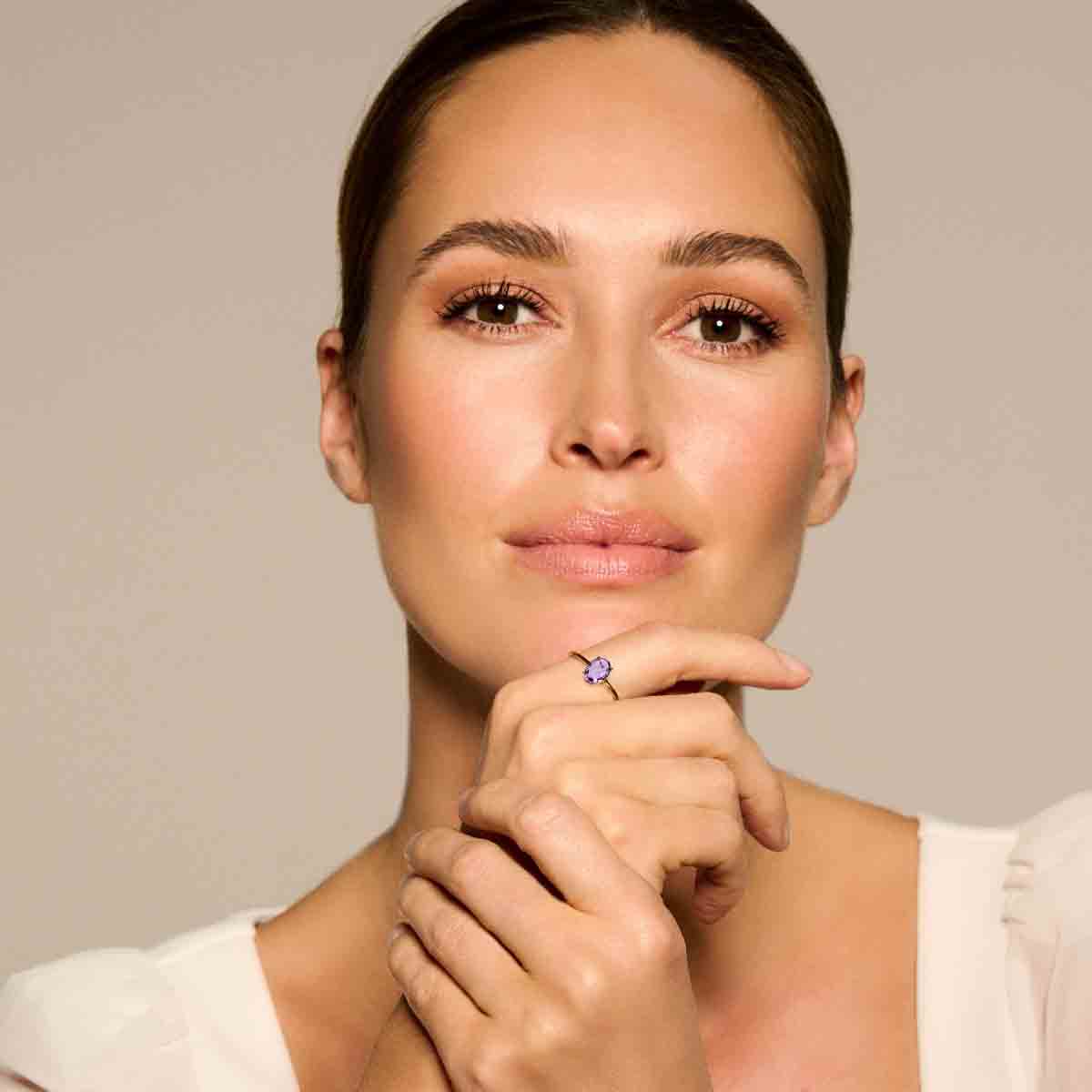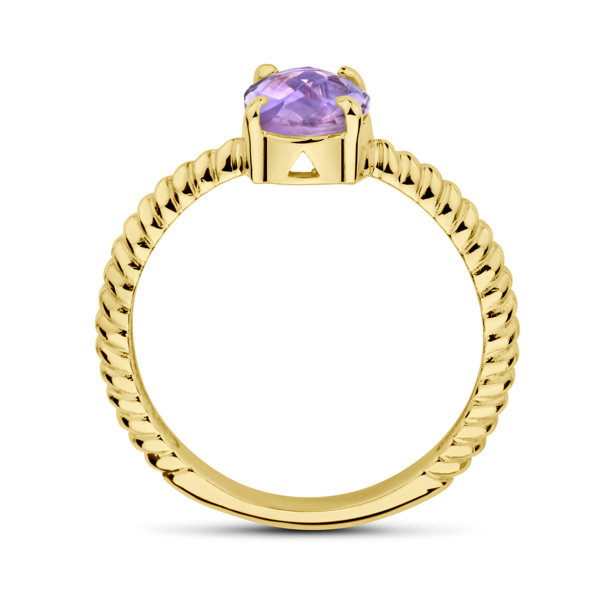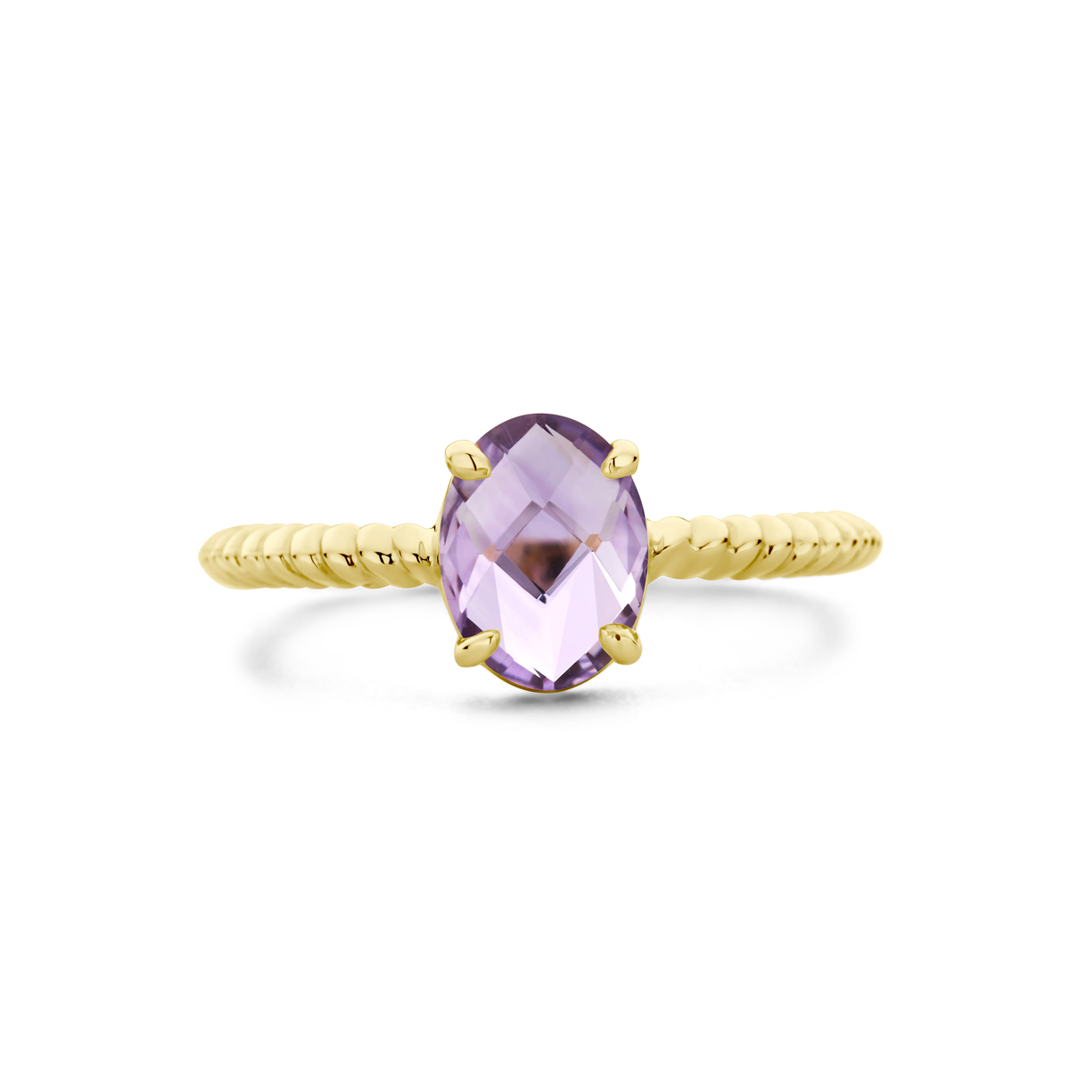 14k Geelgouden ring uitgevoerd met amethist. De steen heeft een afmeting van 8x6mm.