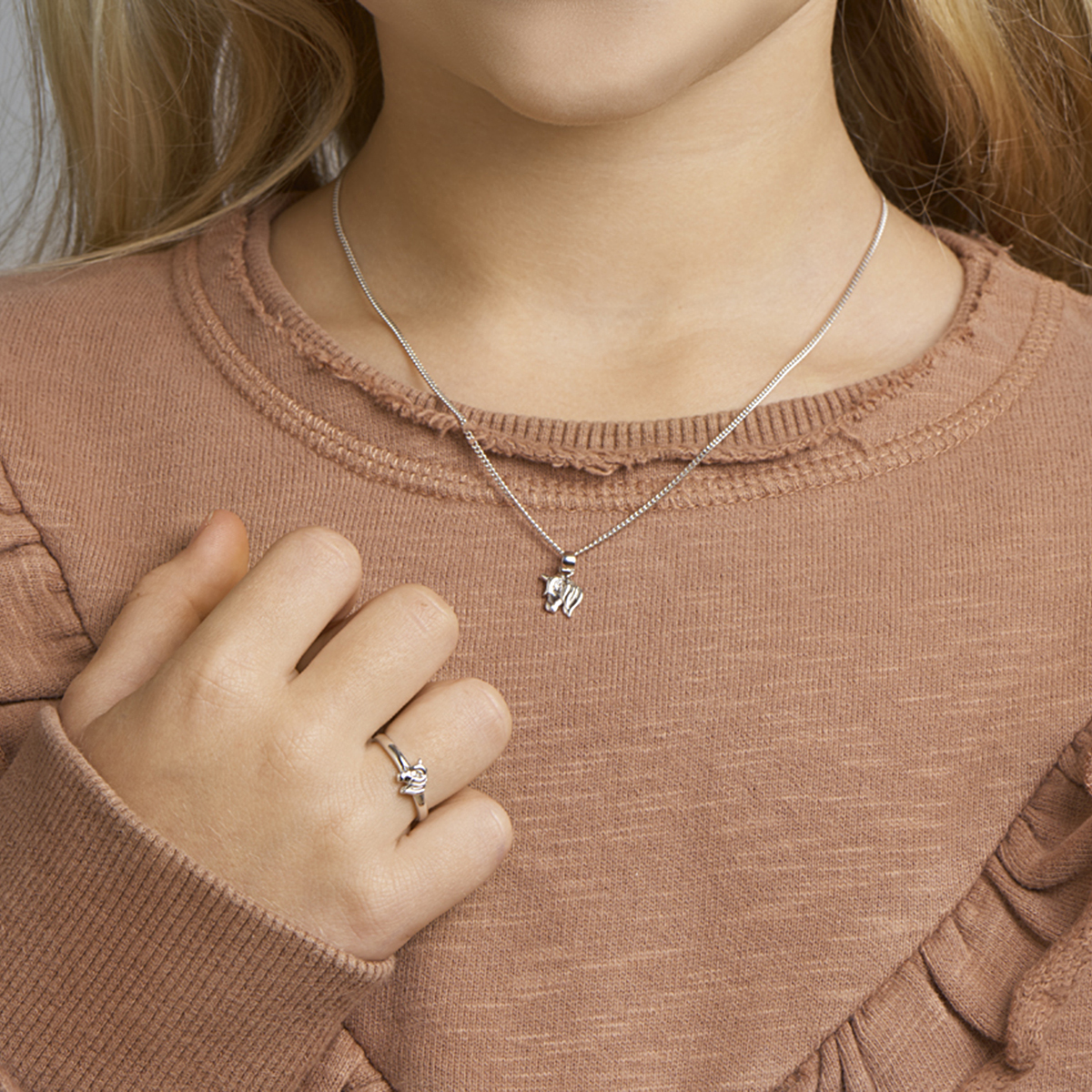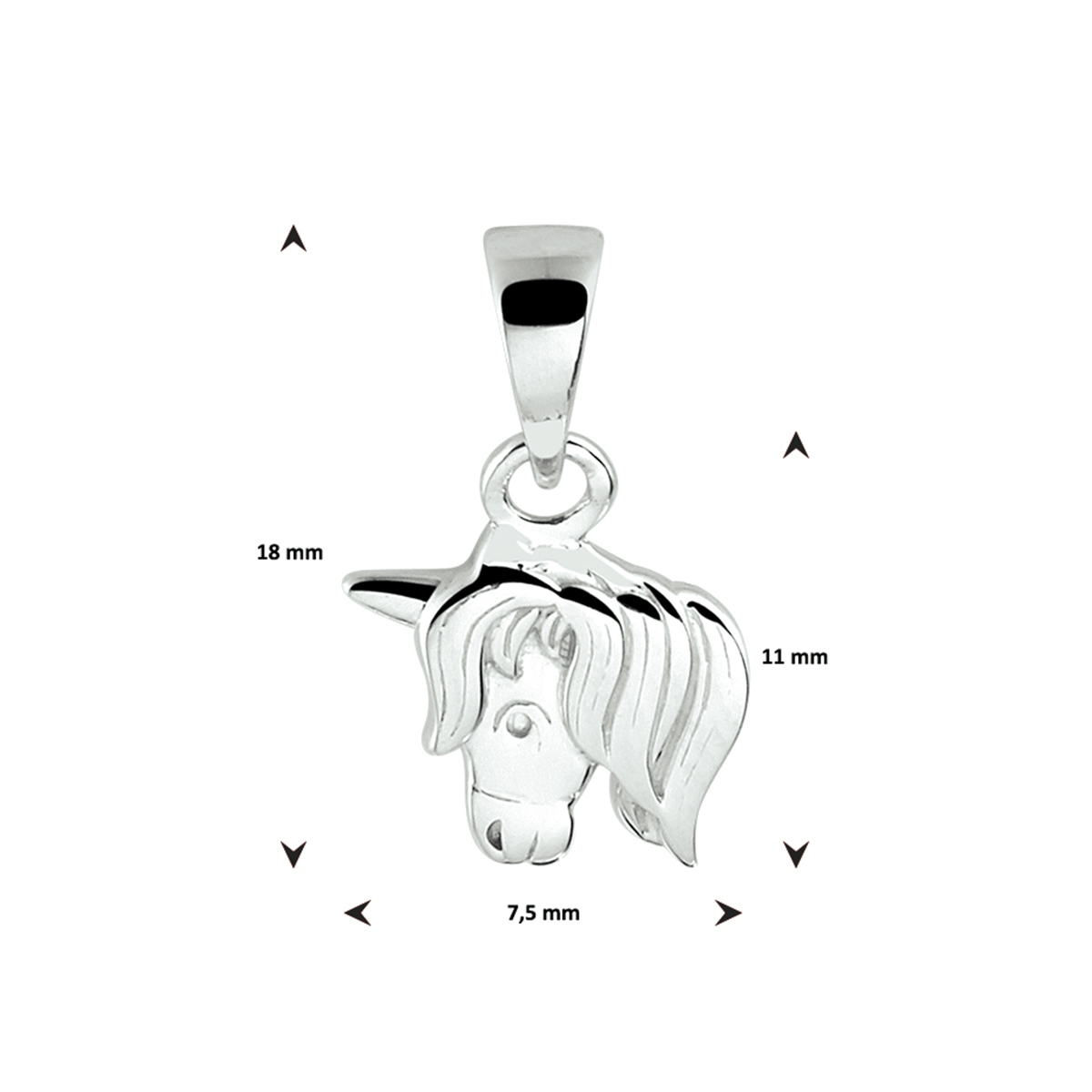 Gerhodineerd zilveren hanger in de vorm van een eenhoorn. De hanger heeft een afmeting van 11x7.5mm en een totale hoogte van 1.8cm.