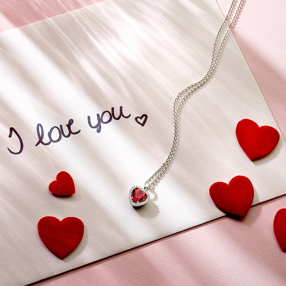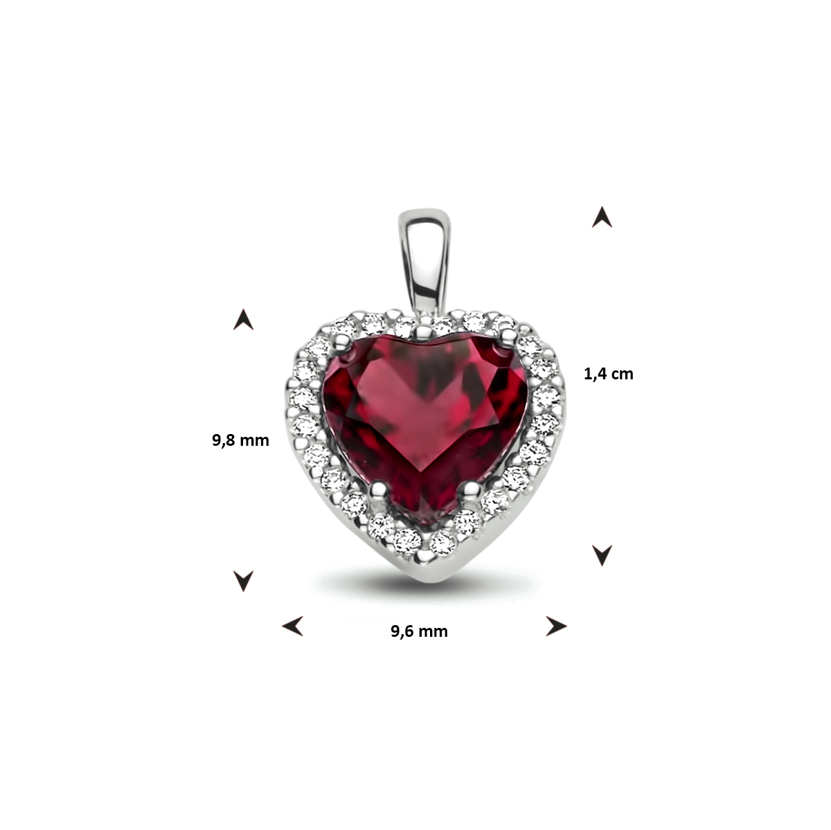 14k Witgouden hanger uitgevoerd in de vorm van een hartje met daarin een schitterende rhodoliet omringd met diamant. De hanger heeft een totale hoogte van 1.4cm en een breedte van 9.5mm.