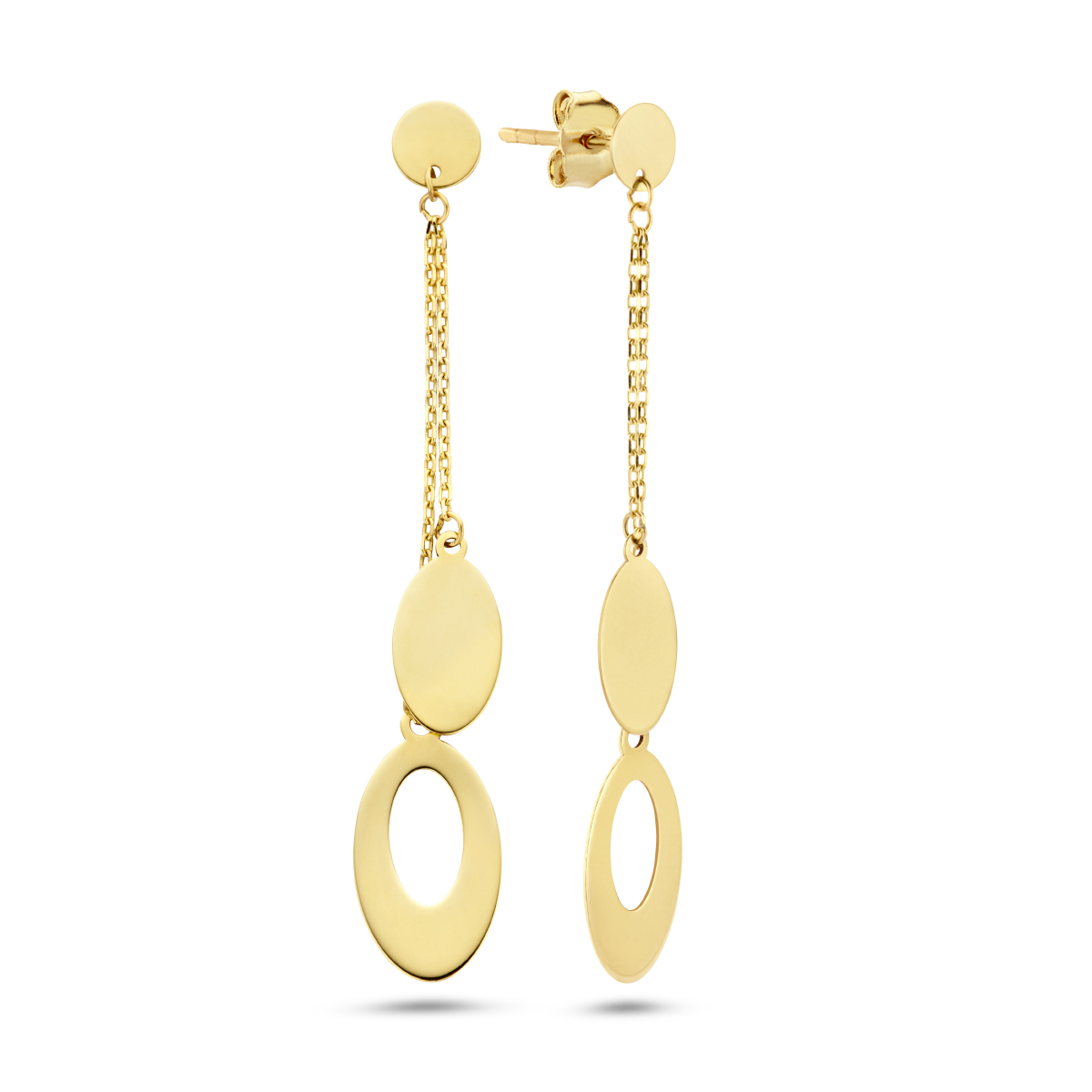 Geelgouden 14kt. oorhangers uitgevoerd met ovalen. De lengte van de oorhangers is 48mm.
