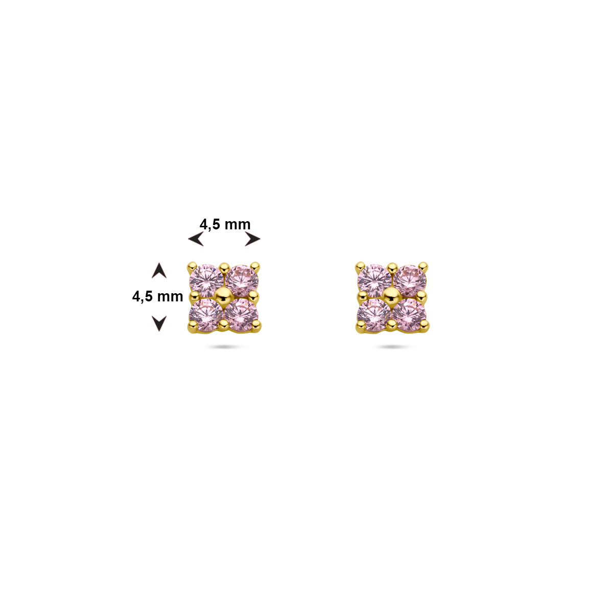 14k Geelgouden oorknoppen uitgevoerd met roze zirkonia. De oorknoppen hebben een afmeting van 4.5x4.5mm.
