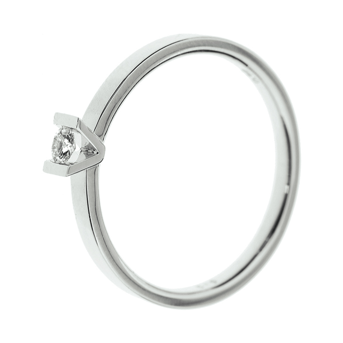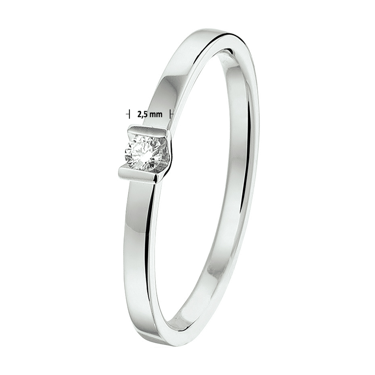 Ring in witgoud met een palladium legering van 2.5mm breed uitgevoerd met een luxe ingespannen briljant geslepen diamant 0.05ct.