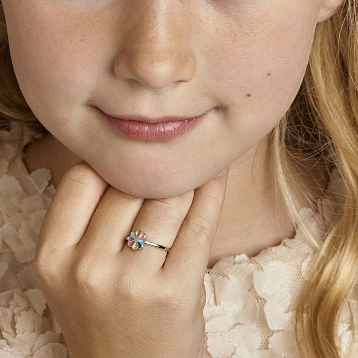 Super leuke bloem ring in gerhodineerd zilver en verschillende vrolijke kleuren emaille. De ring heeft een diameter van 7.5mm en is verkrijgbaar in verschillende maten. De ring is te combineren met bijpassende sieraden uit onze collectie. Tip: Leuk om kado te geven! Zie je ze al stralen!?