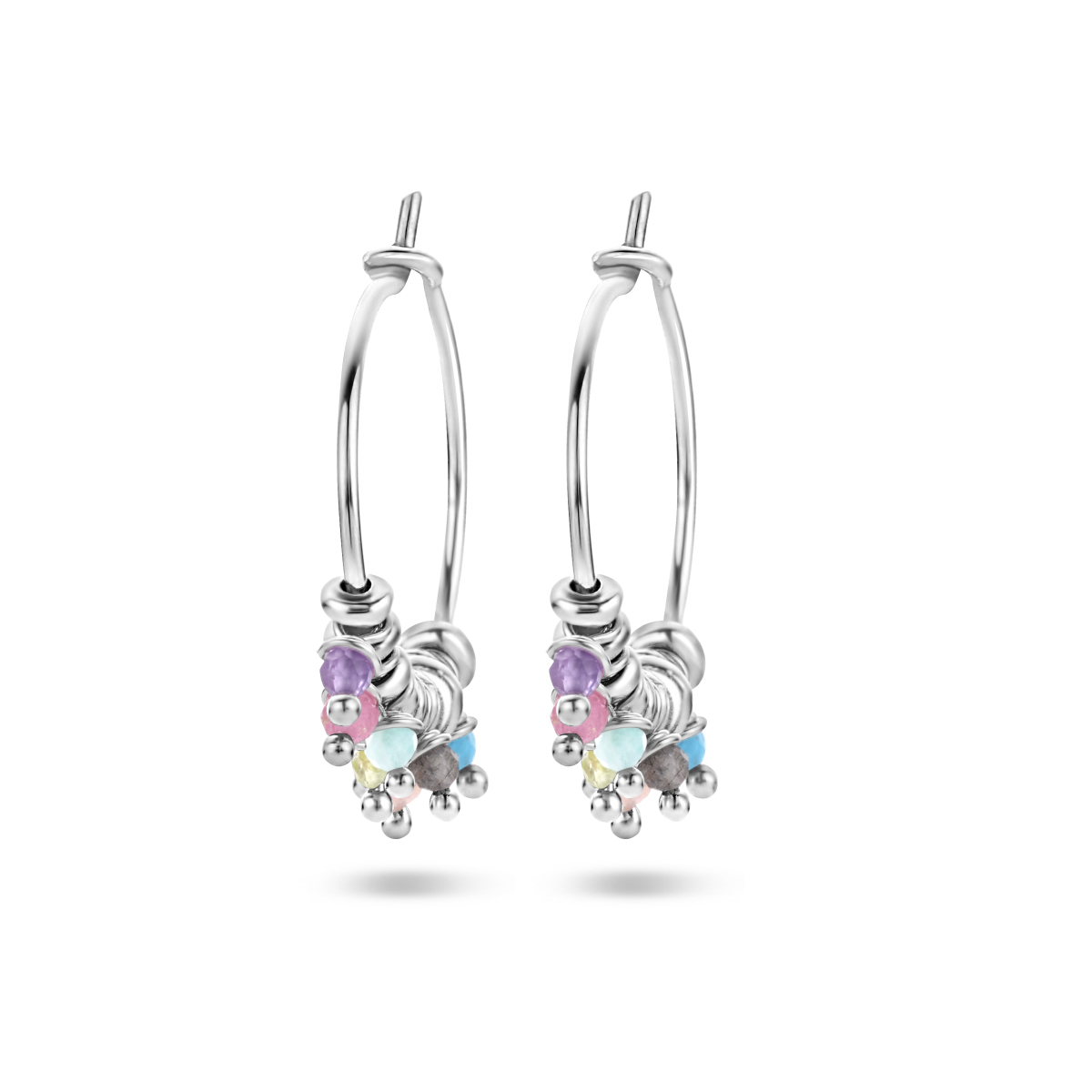 Gerhodineerd 925 zilveren oorringen uitgevoerd met verschillende edelstenen zoals: amethist, blauw apatiet, amazoniet, groen agaat, rhodoliet, rutiel kwarts, toermalijn en geel opaal De oorringen hebben een afmeting van 18.5x1mm.