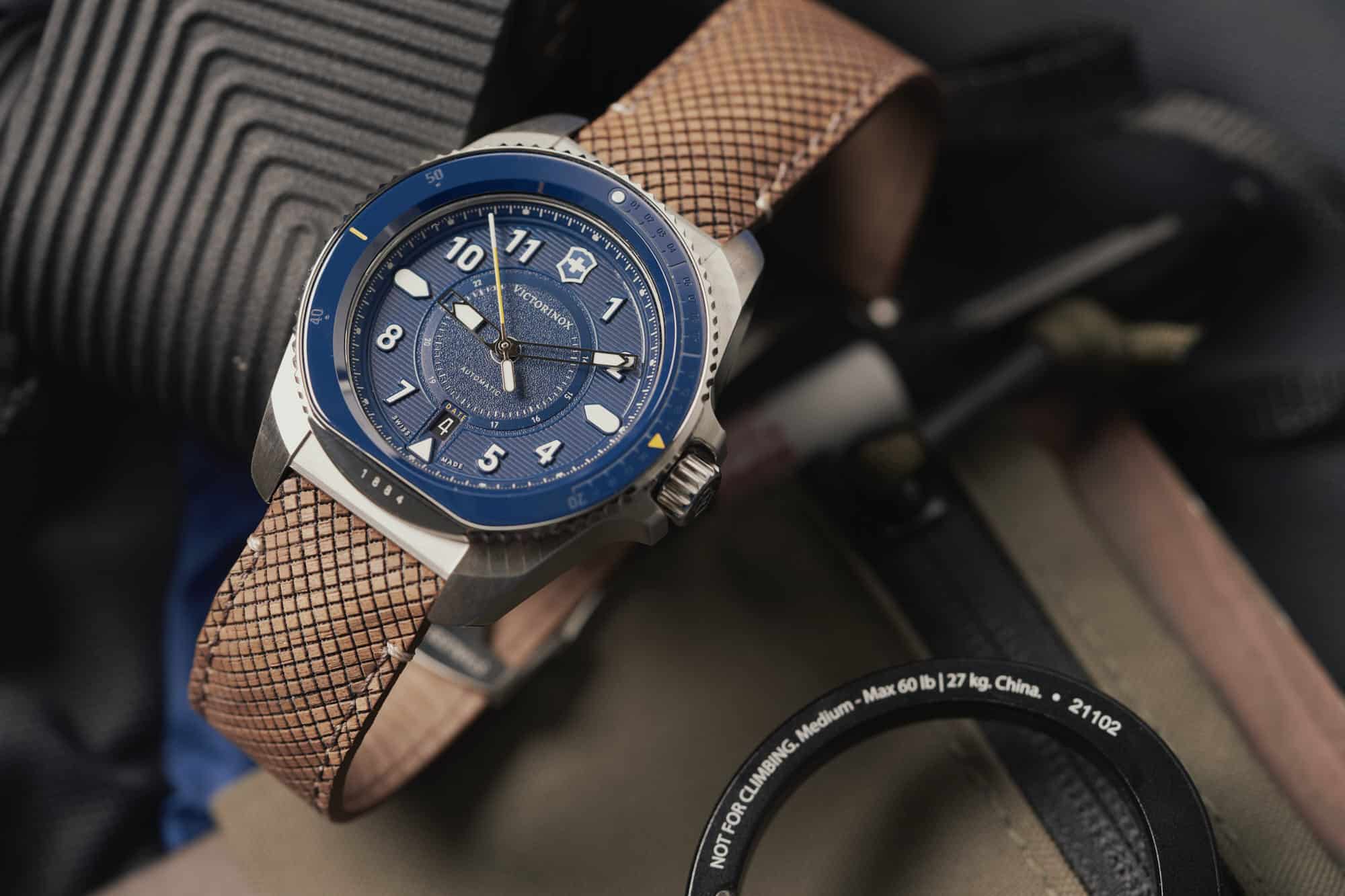 Victorinox Journey automaat met bruine houten band met vouwsluiting en extra blauwe siliconen band