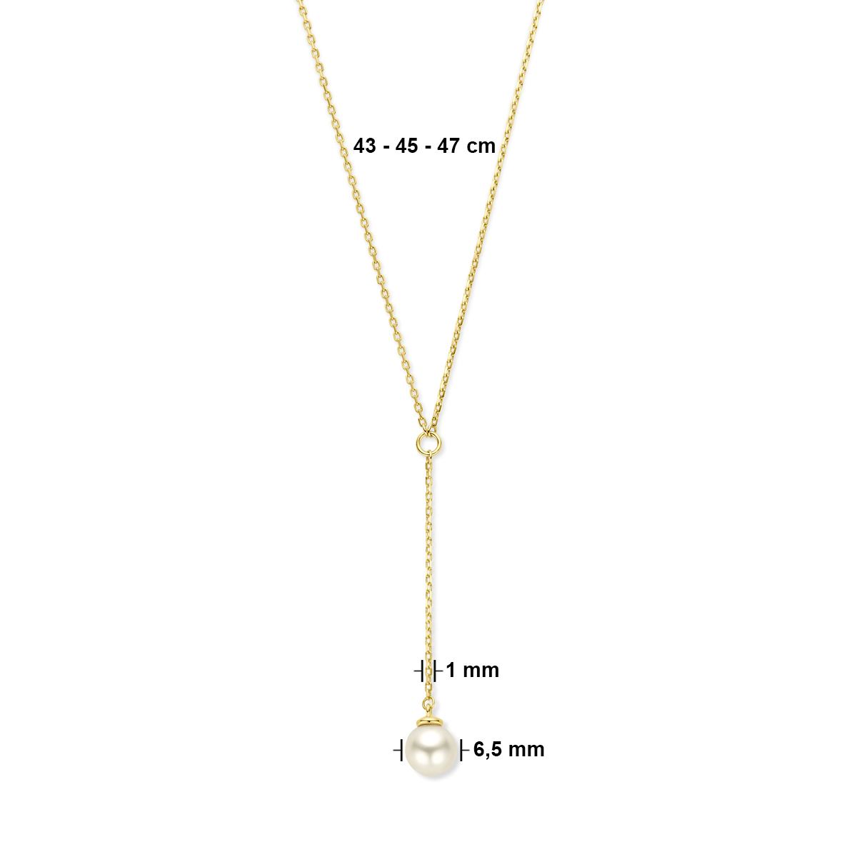 14k Geelgouden Y-collier uitgevoerd met zoetwaterparel. Het collier heeft draaglengtes van 43, 45 en 47cm. De parel heeft een maat van 6.5mm.